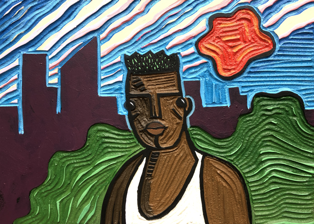 6×8” Acrylic paint with acrylic markers on carved and painted linoleum block
