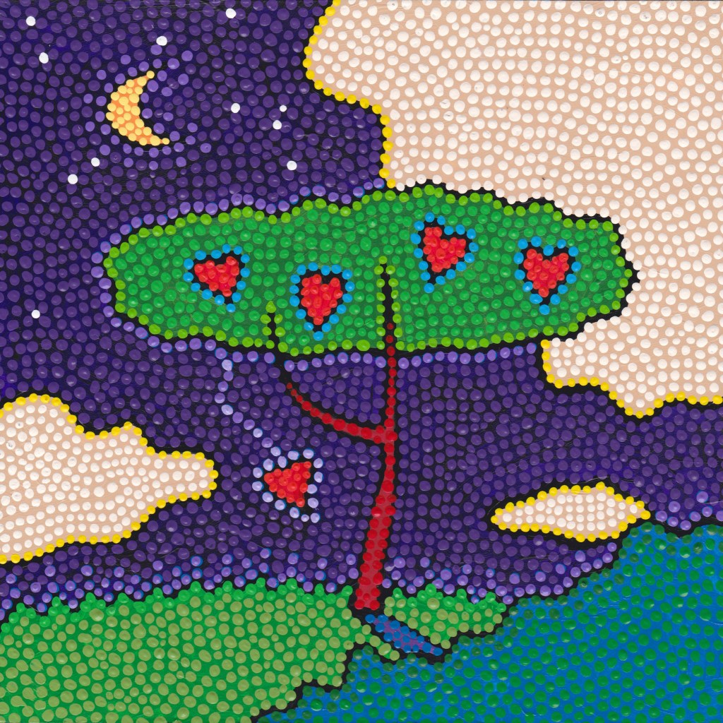 Leaving the loving embrace of family to move out and make its own way in the world? A seed falling to perhaps grow a new tree of love? If so, a joyful painting, full of hope. Or… well, let’s not dwell on sadness, though it may be so in this case. Either way, an opportunity for growth, I think. But it’s what it says to you, after all.