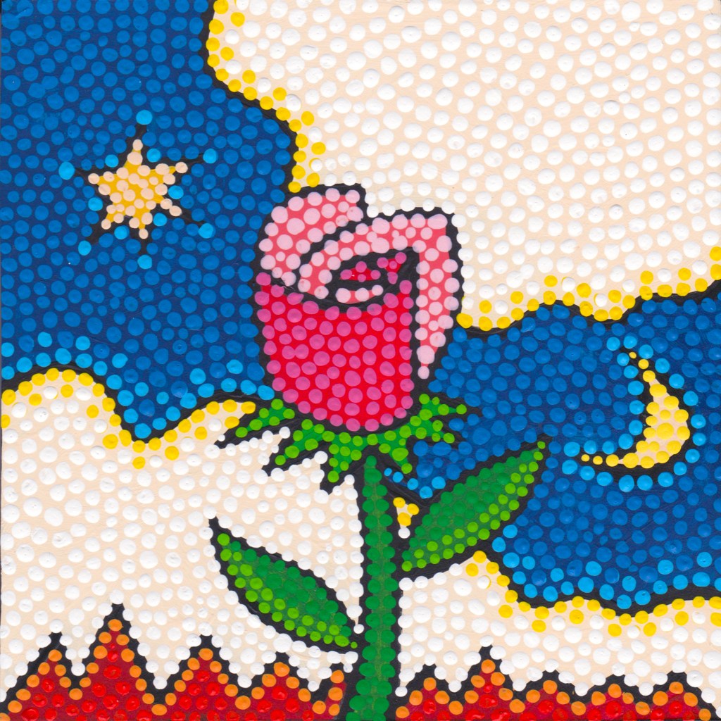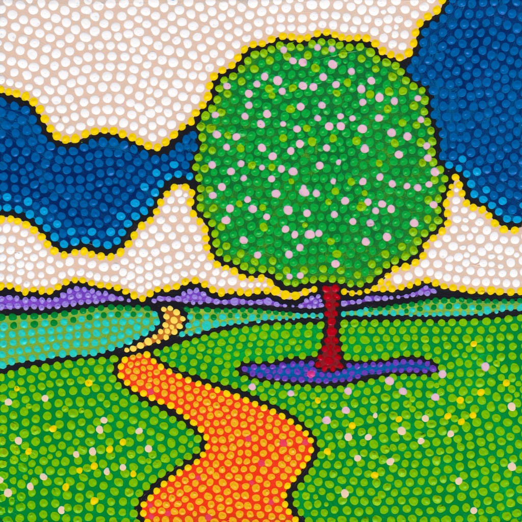 So I’m done for now on saints paintings, whether animals or humans. Maybe I’ll get back to them later, who knows? But for now, I’m having the most fun painting that I’ve had in many years. I’ve made some modifications to the pointillist technique I painted in years ago, and it’s really working out well. I’ve done a bunch of small ones over the last week or two and they are bright, happy, and super colorful. I’ll start posting them soon.
