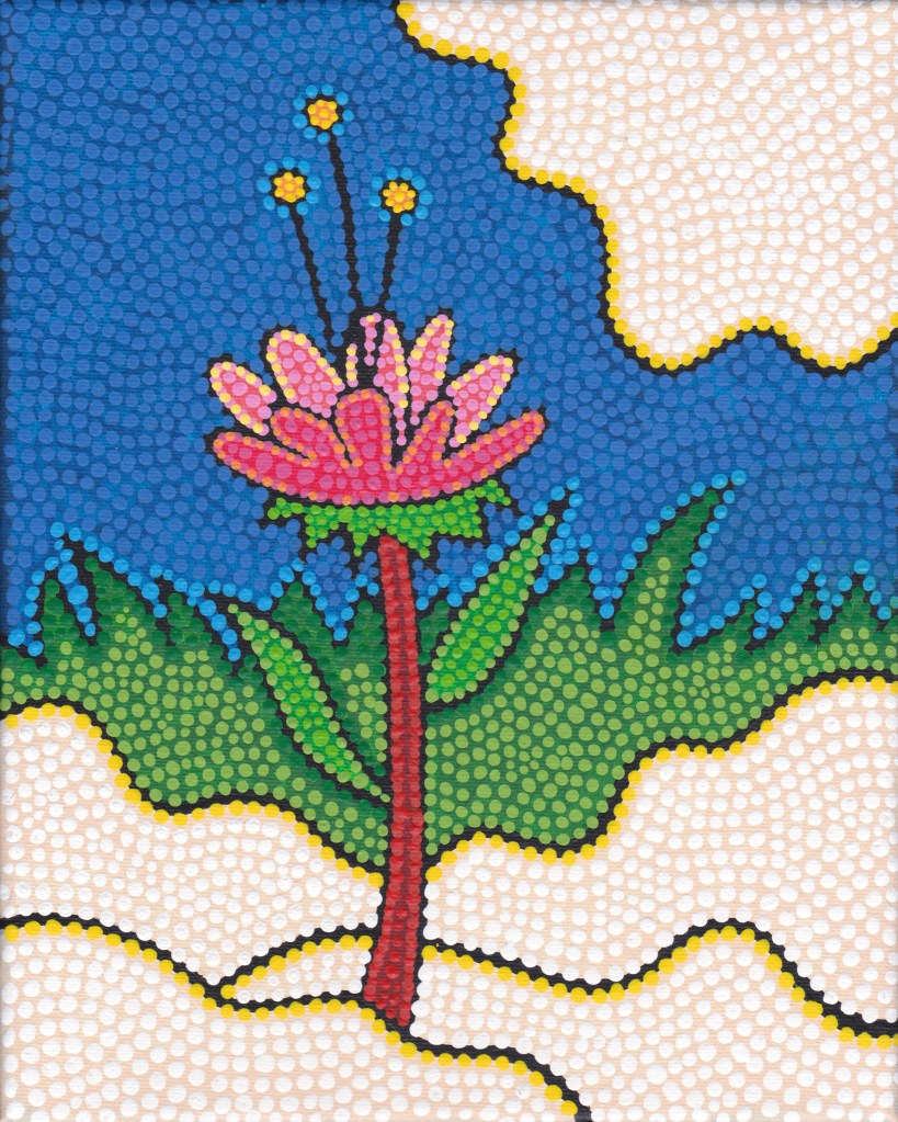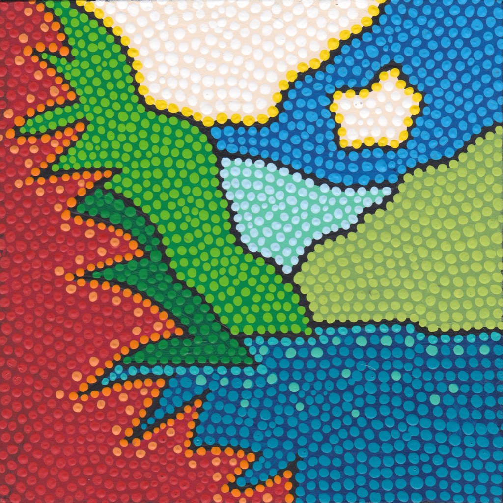 I also did something completely different, in that up until this piece, I’ve been using background colors that are a darker version of the main color of the dots in that particular area. Then I paint a heavy black outline around each area of color before painting the dots.