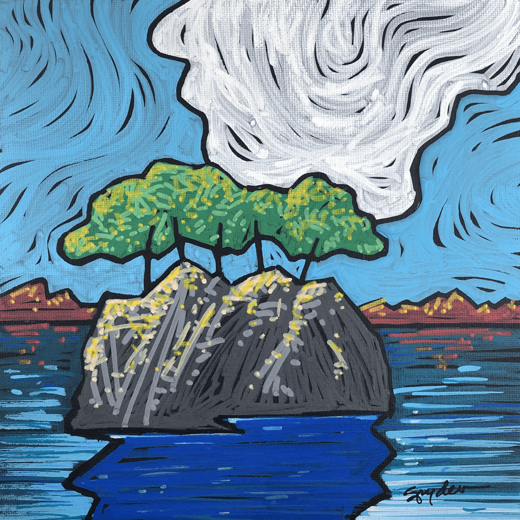 Lush trees growing on an isolated rock testify to the tenacity, resilience and ubiquity of life.