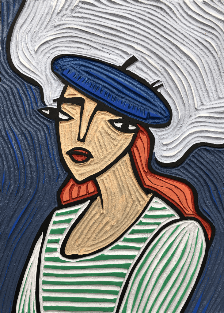 6×8” Acrylic paint with acrylic markers on carved and painted linoleum block