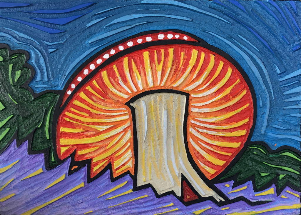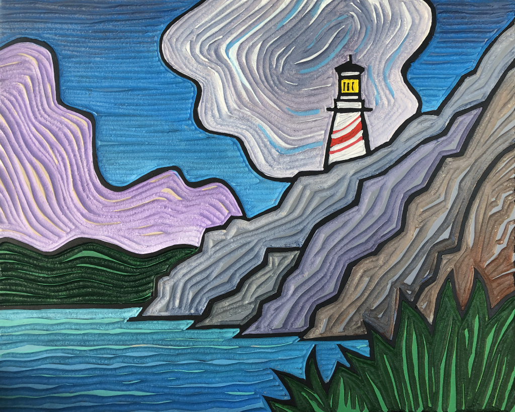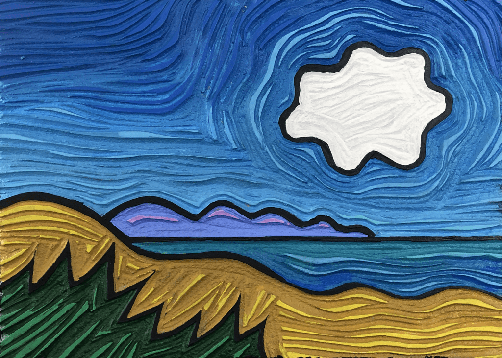 7×5″ Acrylic and acrylic markers on carved linoleum block