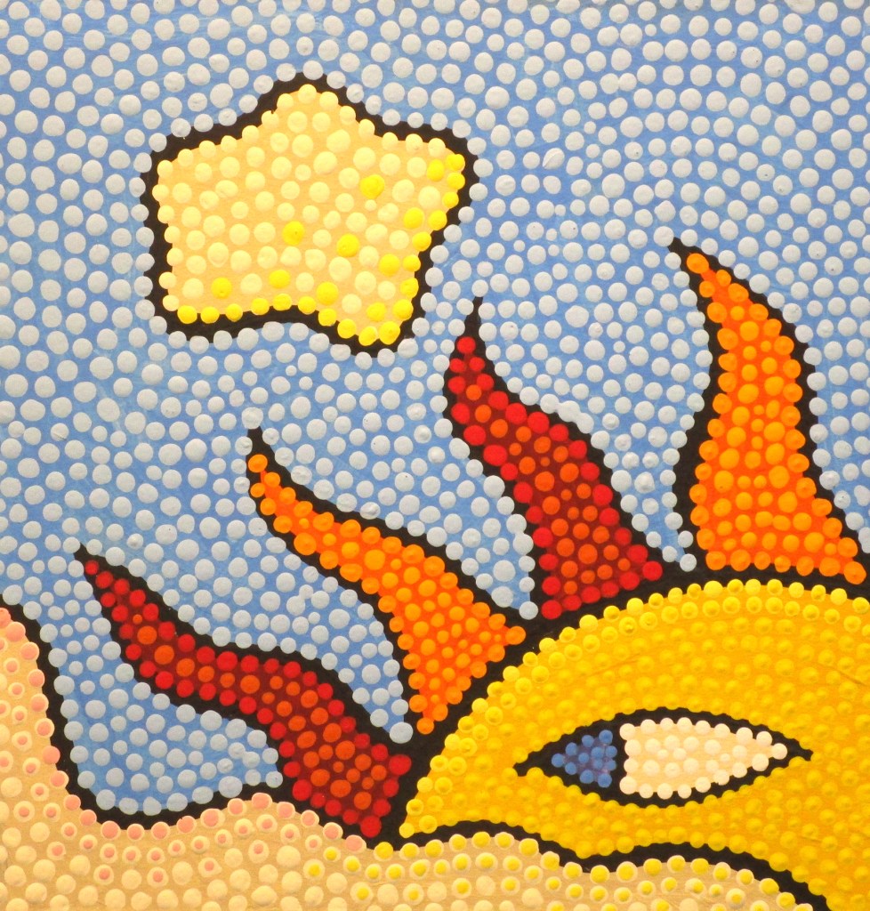I also did something completely different, in that up until this piece, I’ve been using background colors that are a darker version of the main color of the dots in that particular area. Then I paint a heavy black outline around each area of color before painting the dots.